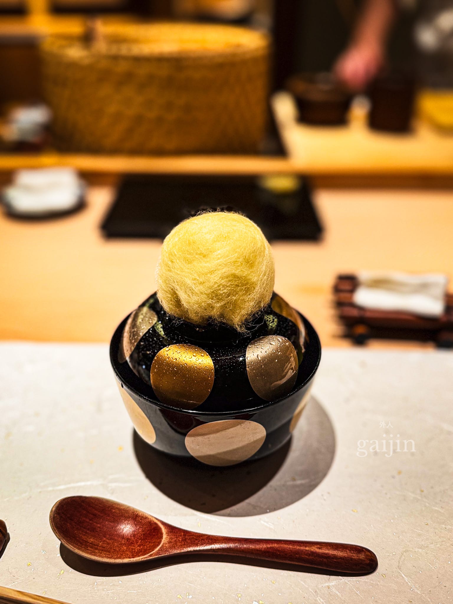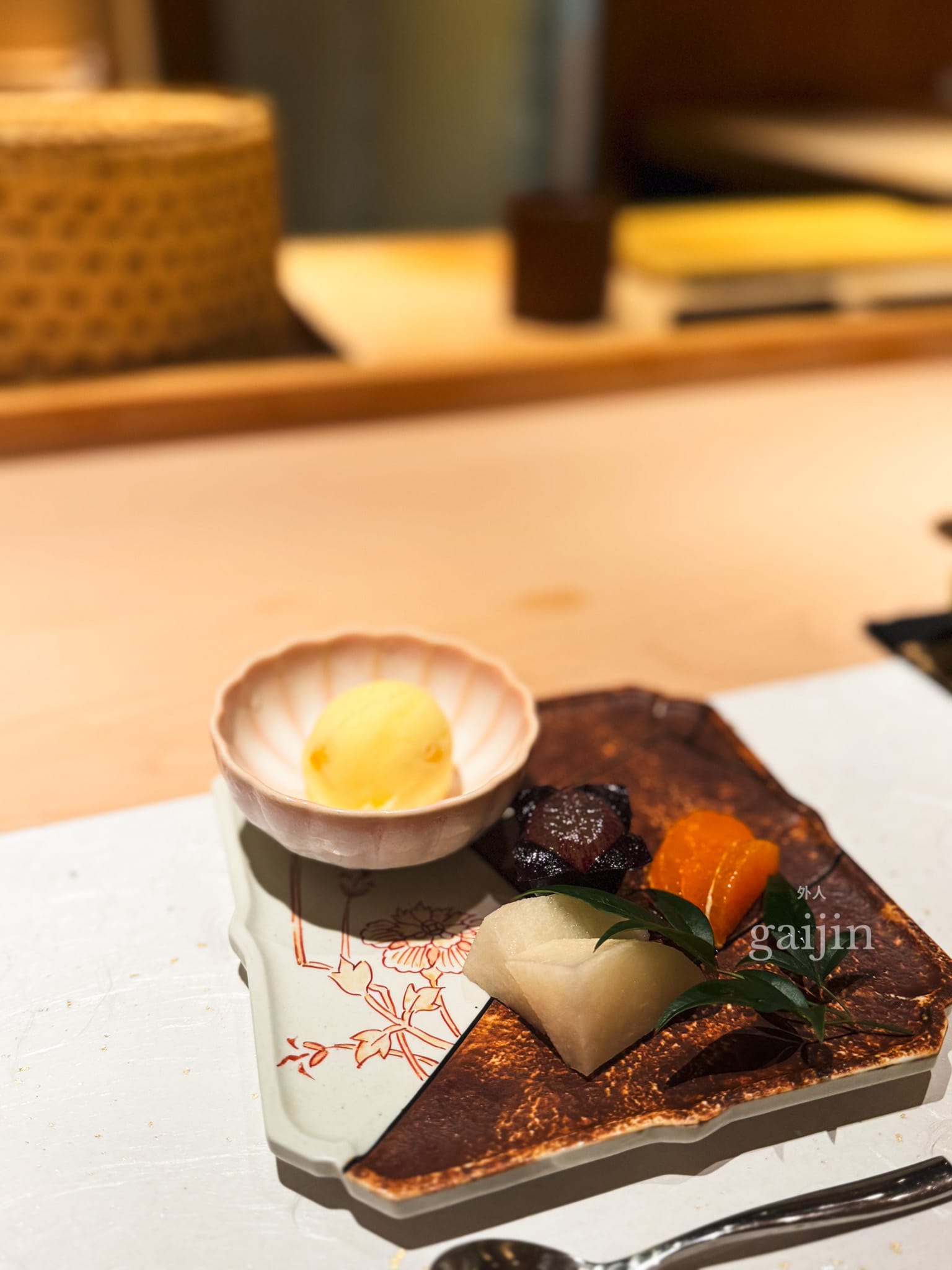 Accompanied by tea, for dessert we had tamagoyaki with a plate of fresh Japanese fruits (mikan, pear, kyoho grape) and sorbet.
