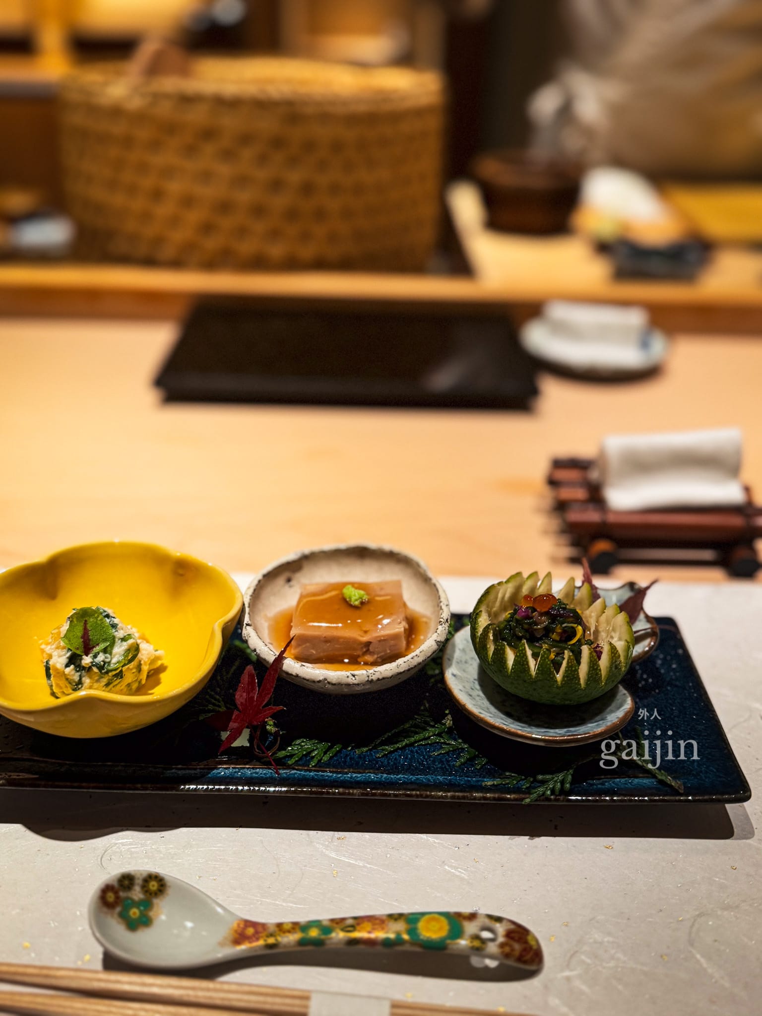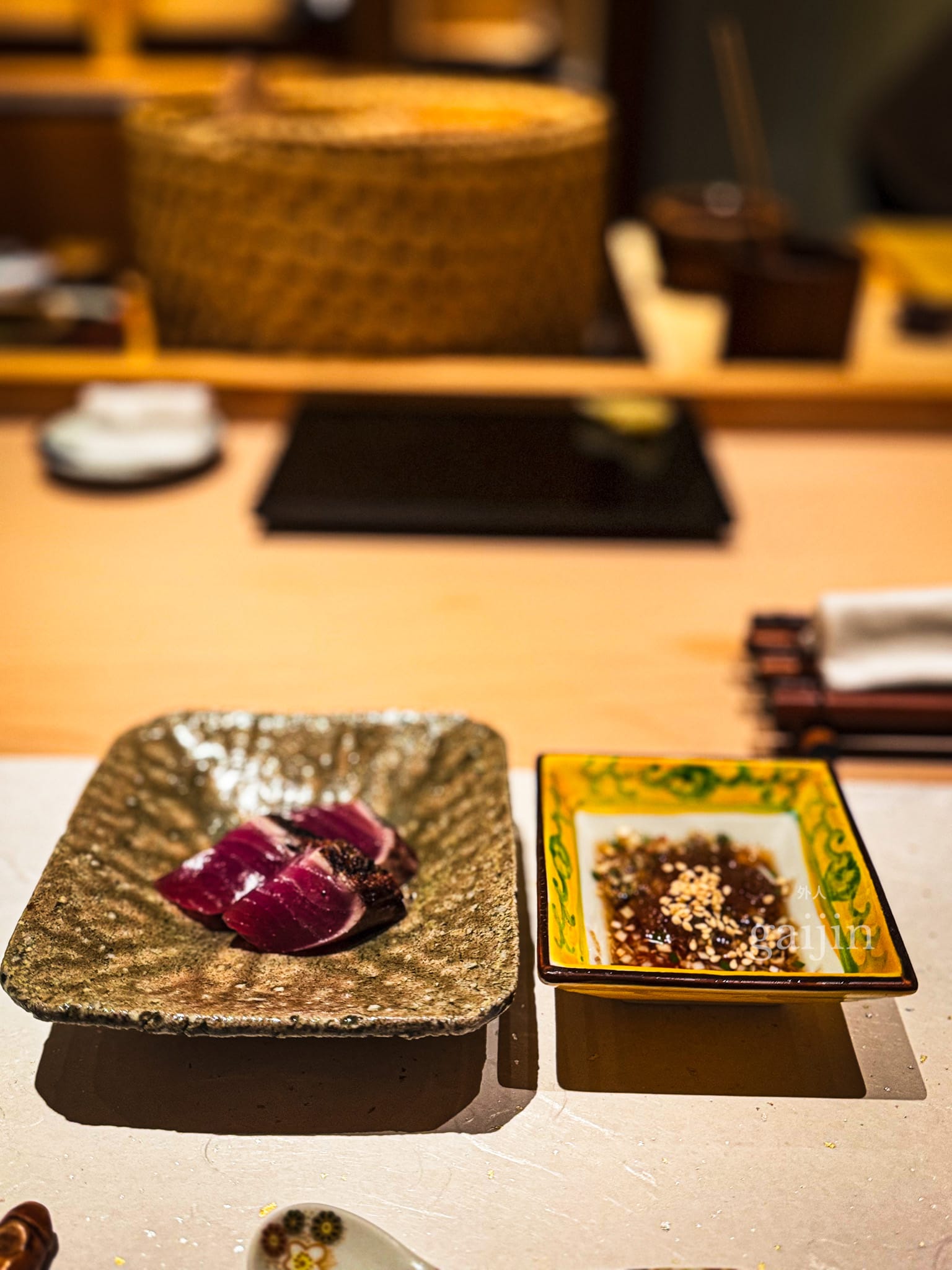 First up, we had a trio of cold appetizers including a tasty yuba (beancurd skin). A fresh plate of katsuo (bonito) was then presented with a side of ponzu dipping sauce. As you can see in the photo, the color of it was gorgeous with a crisp outside, balancing some chewiness with the burnt skin and sourness from the ponzu.