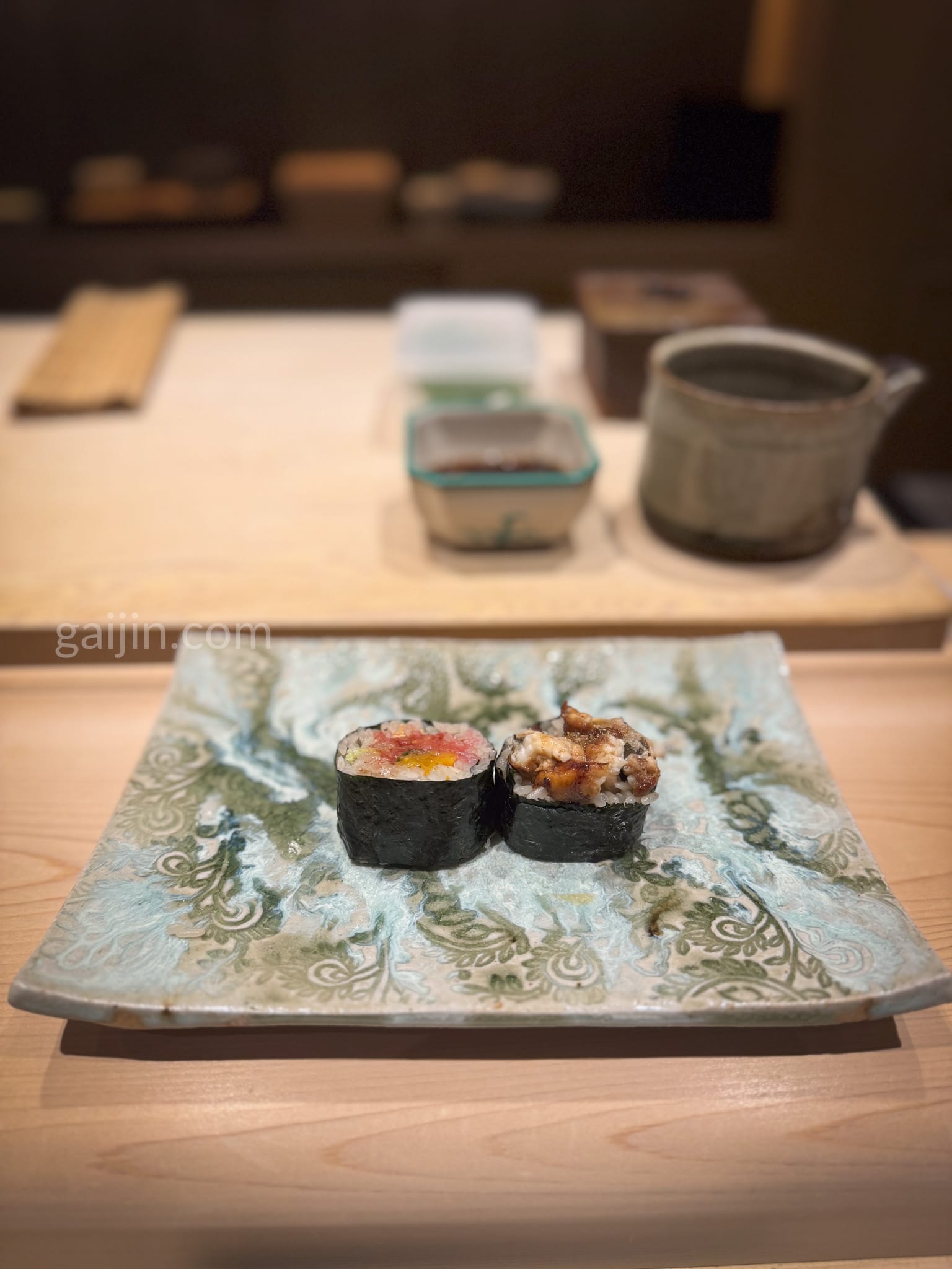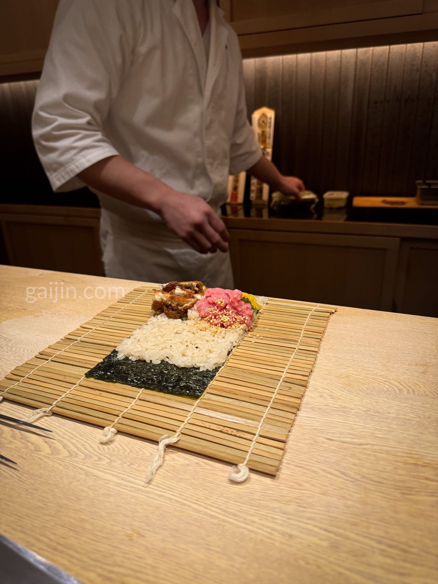 A departure from tradition came in the form of an opulent maki roll featuring grilled anago and minced fatty tuna, replacing the usual negitoro or pickled roll.